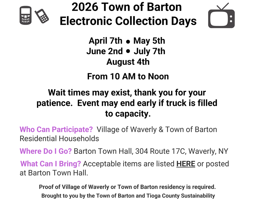 Recycling is mandated by law in New York State and Tioga County (Tioga Local Source Separation Law) and applies to households, multifamily dwellings, businesses and institutions.